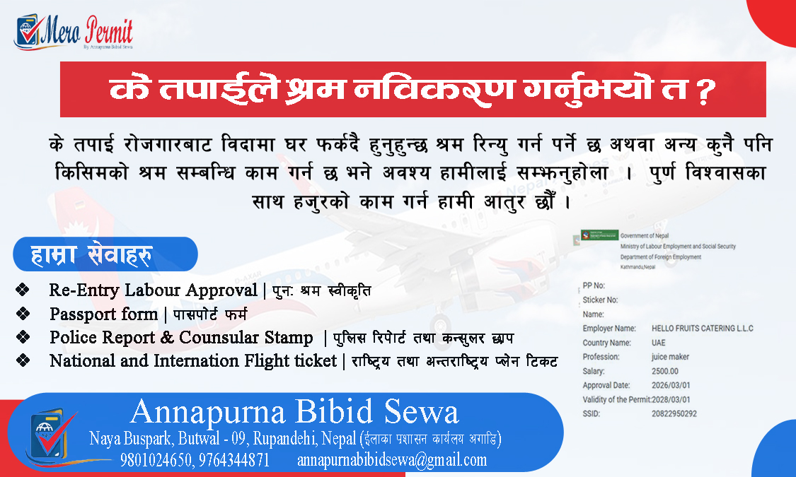 Re-Entry Labour Approval is a mandatory process for Nepali migrant workers who are returning to their existing foreign employment after coming back to Nepal on leave Re-Entry Labour Approval is a mandatory process for Nepali migrant workers who are returning to their existing foreign employment after coming back to Nepal on leave or vacation. It ensures that the worker’s employment status, documents, and migration records remain valid and compliant with Nepali foreign employment regulations. Read More