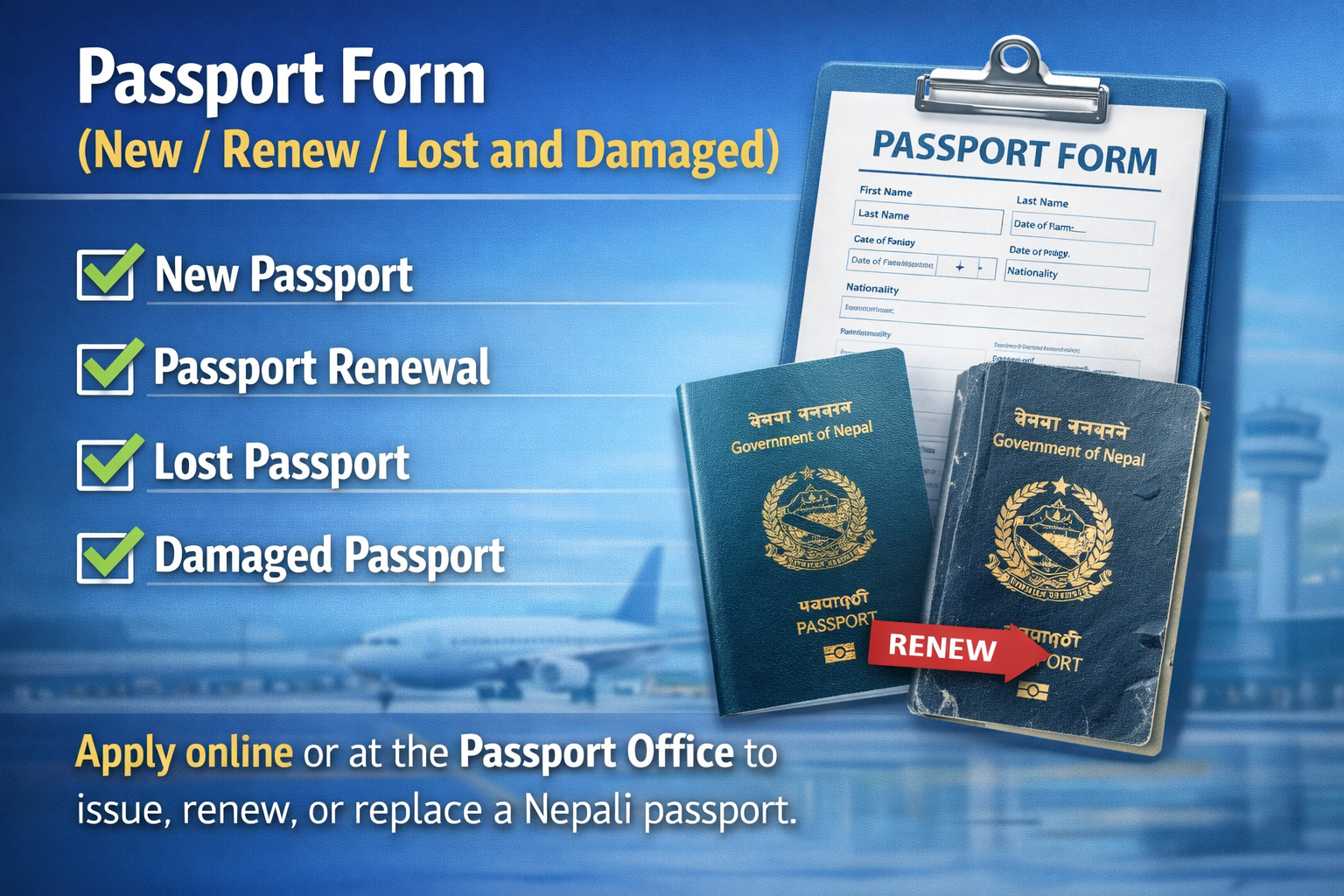 Passport Form (New / Renew / Lost & Damaged) is the official application process required to issue, renew, or replace a Nepali passport. A valid passport Passport Form (New / Renew / Lost & Damaged) is the official application process required to issue, renew, or replace a Nepali passport. A valid passport is an essential travel document for foreign employment, study, tourism, and international travel. This service is provided by the Department of Passports, Nepal, and applies to all Nepali citizens who need a passport for the first time, whose passport has expired or is about to expire, or whose passport has been lost or damaged. Read More