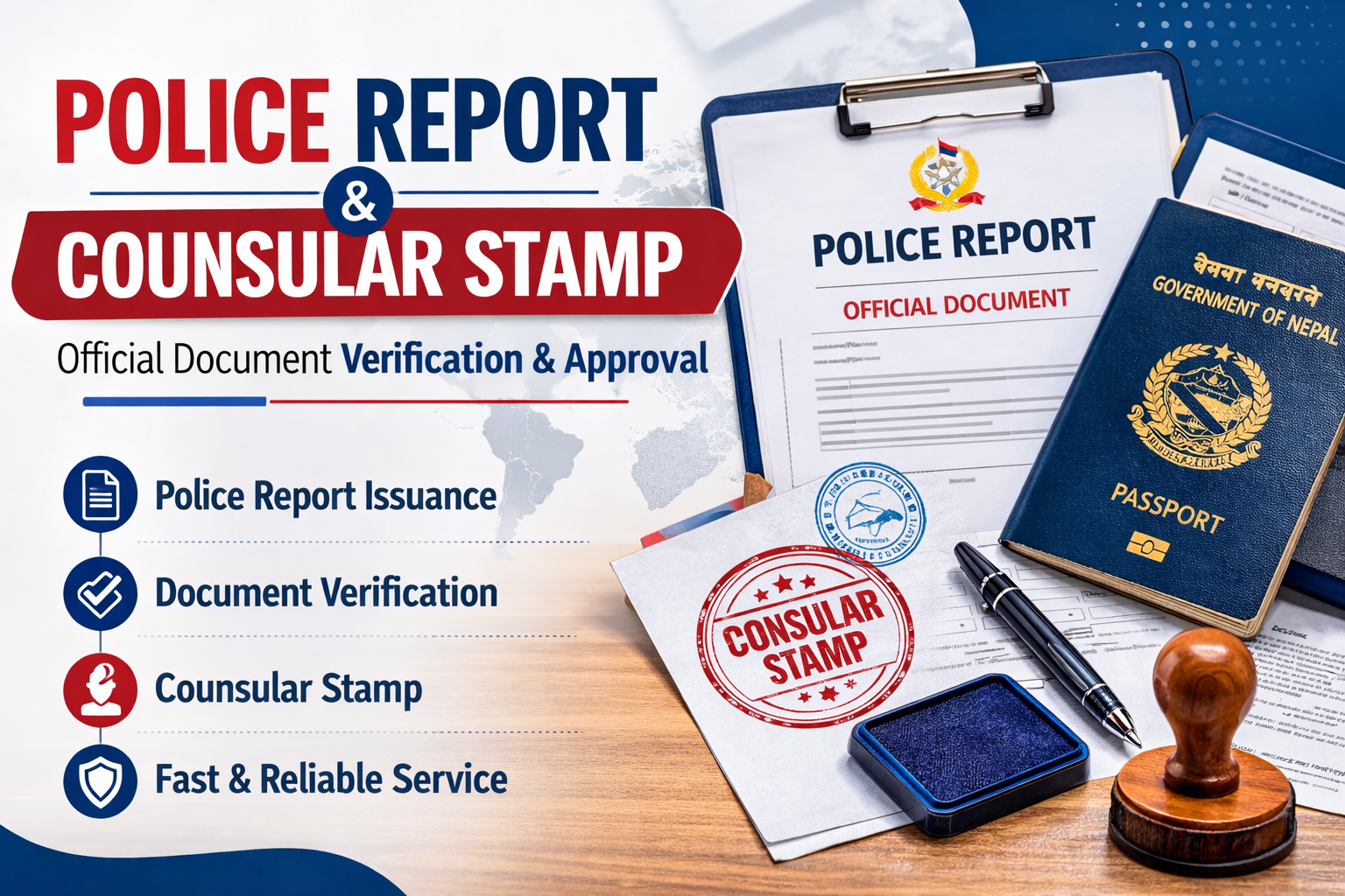 Police Report & Consular Stamp are essential verification documents required for various official purposes such as foreign employment processing, visa applications, and legal validation of documents. Police Report & Consular Stamp are essential verification documents required for various official purposes such as foreign employment processing, visa applications, and legal validation of documents. A Consular Stamp is an official authentication provided by the Ministry of Foreign Affairs or a Nepali embassy/consulate abroad. It verifies that documents such as police reports, contracts, certificates, or letters are genuine and legally accepted for use in foreign countries. Read More